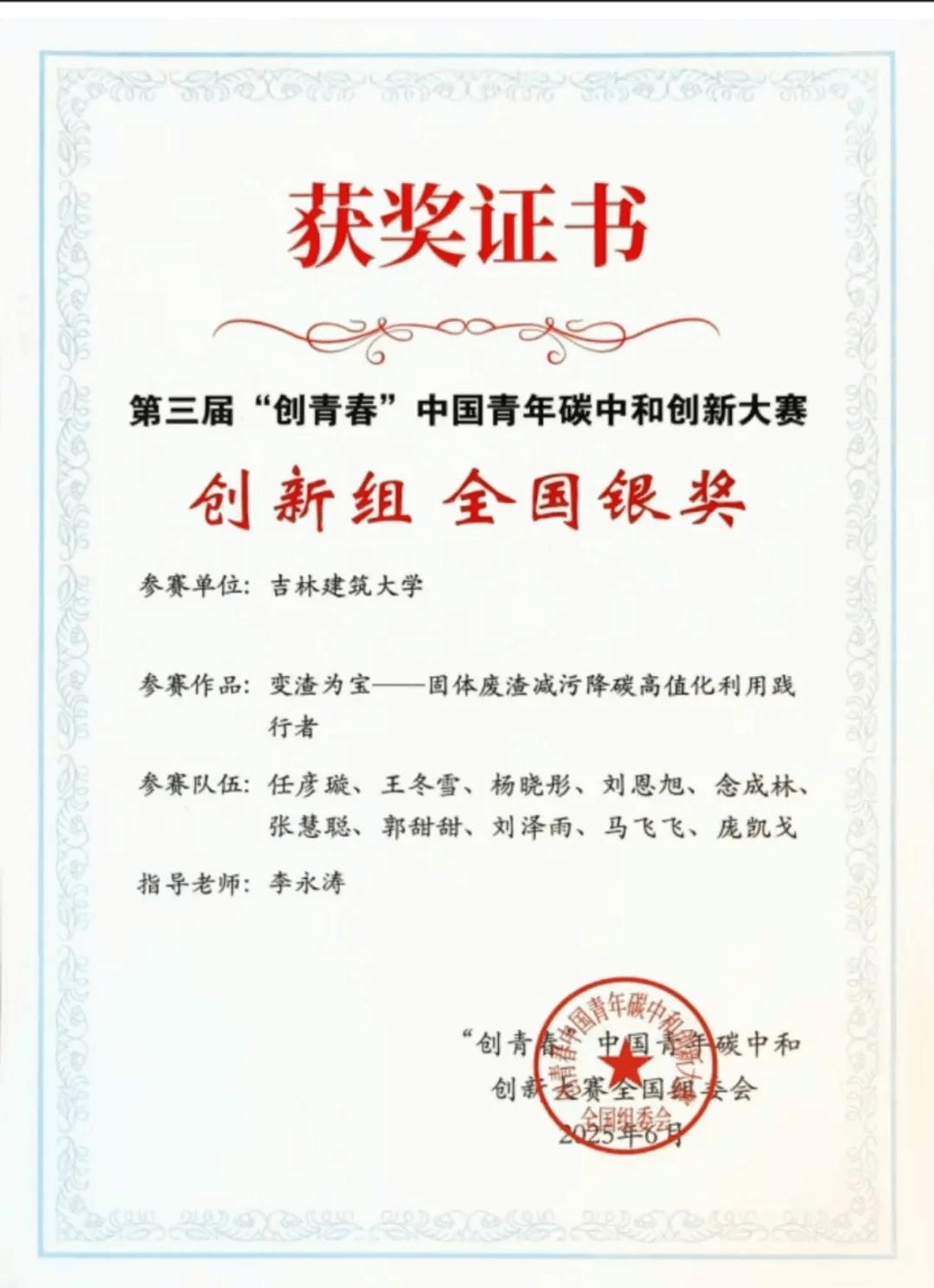 2025年6月7日至8日,第三届“创青春”中国青年碳中和创新大赛国赛在国家会议中心举行,我院李永涛教师团队(变渣为宝--固体废渣减污降碳高值化利用践行者)经过网评,区域赛和国赛,最终获得创新组国家级银奖,这也是学校首次在该赛事上获得国家级奖项,此次历史性突破,不仅是团队成员日夜攻坚的心血结晶,更是学院深耕产教融合、厚植创新基因的实力见证。