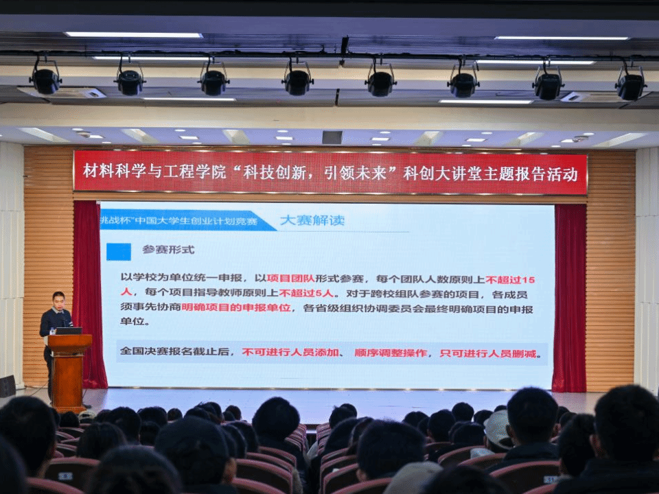 为深入学习贯彻党的二十届四中全会精神,全面落实习近平总书记关于青年工作和教育工作的重要指示精神,进一步提升我校学生的创新思维和科学素养,材料科学与工程学院2025年11月14日在逸夫楼报告厅举办了“科技创新,引领未来”科创大讲堂主题报告活动。本次活动由学院党委副书记李永涛老师担任主讲,部分教师代表及来自11个学院的300余名学生共同参加。