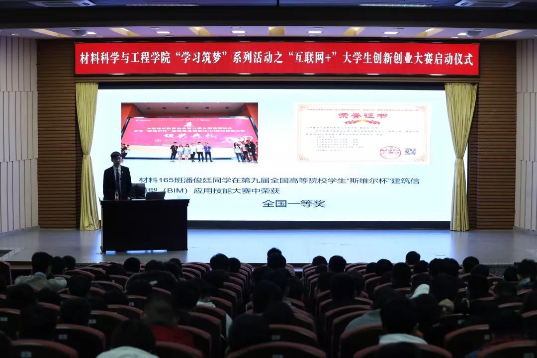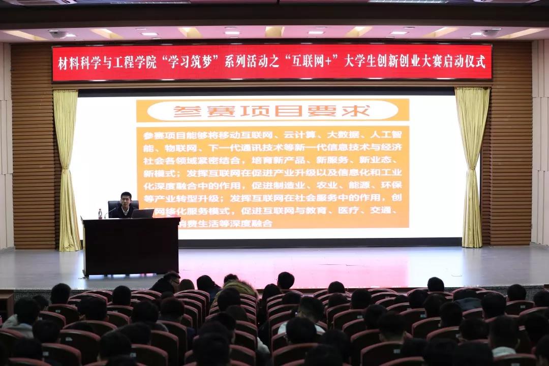 2019年4月2日19时,材料科学与工程学院在学校逸夫楼报告厅举办“学习筑梦”系列活动之第五届“互联网+”大学生创新创业大赛启动仪式。启动仪式由材料科学与工程学院刘卉昇老师主持,原教育部中国“互联网+”大学生创新创业大赛专家委员、市政学院2017级辅导员王金龙老师主讲,材料科学与工程学院学工办教师以及学院全体2018级学生出席此次活动。