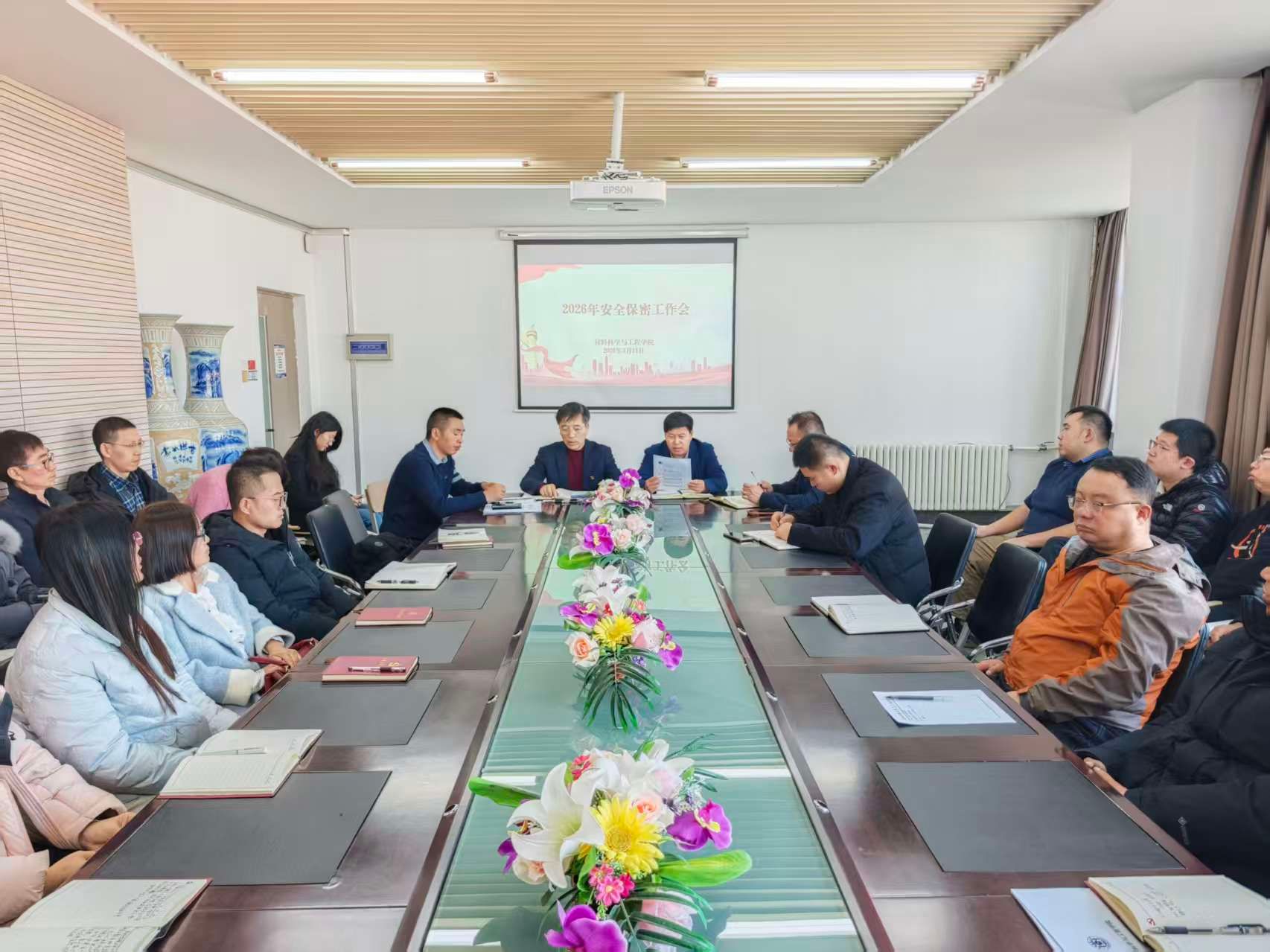 3月11日下午,材料科学与工程学院在行政楼B区313会议室召开2026年安全保密工作会议。学院党委书记周景民、院长赵洪凯、党委副书记李永涛、副院长丁锐、汪佳及全体教师参加会议。会议由周景民主持。